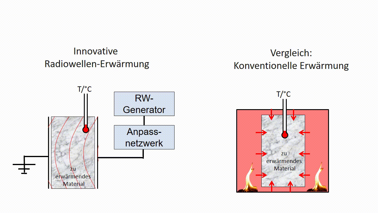 Bei der konventionellen Erwärmung von Materialen wird Wärme von außen nach innen geleitet. Dieser Vorgang nimmt einige Zeit in Anspruch bis das Material vollständig erwärmt ist. Durch das direkte Erwärmungsverfahren mit Radiowellen wird das Material dagegen gleichmäßig im gesamten Volumen erwärmt. Dadurch können größere Volumen in wesentlich kürzerer Zeit kontrolliert erwärmt werden.